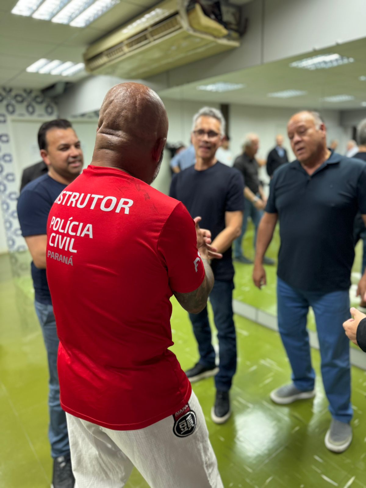 À tarde, o treinamento seguiu com a participação do público masculino. A instrução ficou a cargo de Ronald Agner, Agente de Polícia Judiciária da PCPR. Agner, que é Faixa Preta de Karatê e Jiu-Jitsu (grau 4), atua na Polícia Civil há 13 anos e é professor da disciplina de Defesa Pessoal na Escola Superior de Polícia Civil do Paraná.